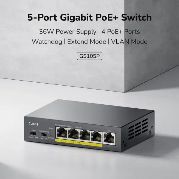 Cudy GS105P, 4 adet Gigabit PoE+ portu ve 1 adet Gigabit uplink portu olmak üzere toplam 5 porta sahip bir anahtardır. 36W toplam güç kapasitesi ve metal kasası ile yüksek hızlı ağlar ve gözetim sistemleri için idealdir. Extend (Uzatma) ve VLAN modları ile PoE Watchdog otomatik kurtarma özelliği desteklenir.